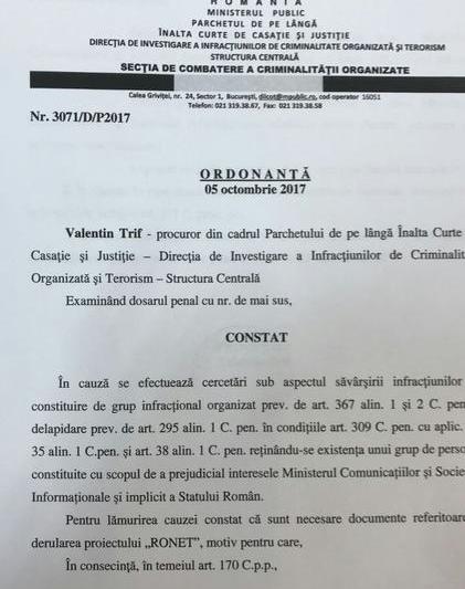 In Ordonanta semnata in data de 5 octombrie 2017, procurorii DIICOT au dispus: