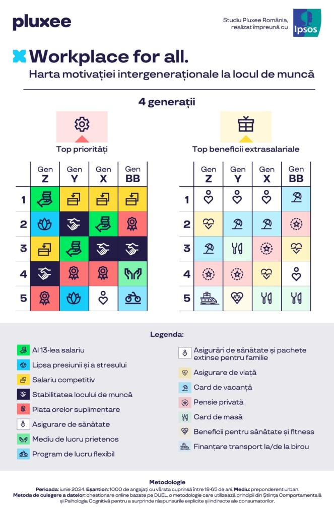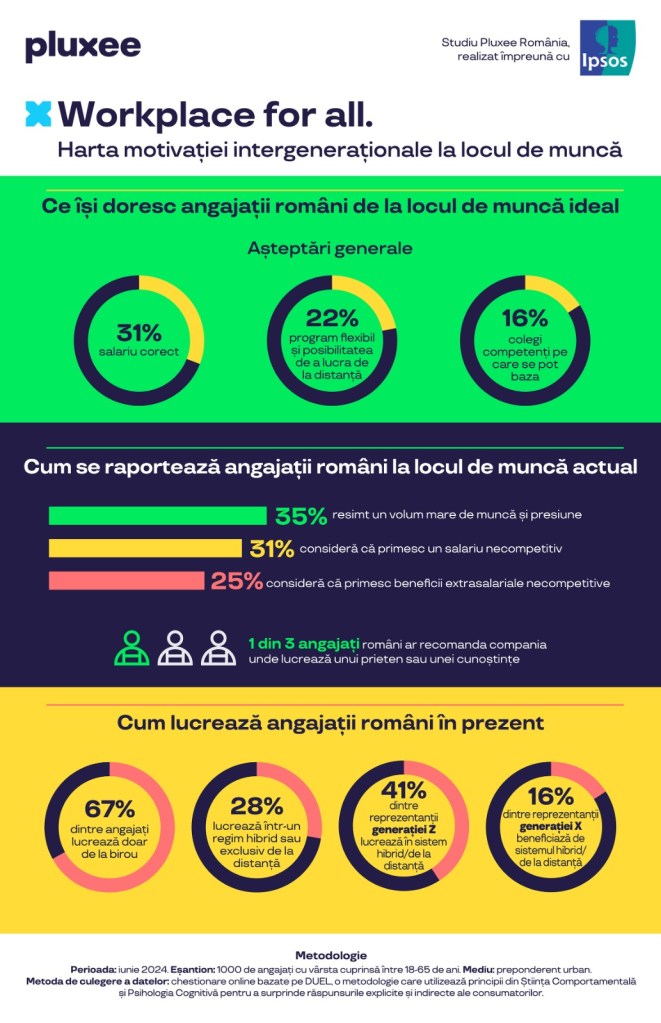 Pe plan local, piața muncii din România se confruntă cu un fenomen accentuat de exod de talente („brain-drain”), arată rezultatele studiului „Workplace for all. Harta motivației intergeneraționale la locul de muncă” realizat de Pluxee și Ipsos România.