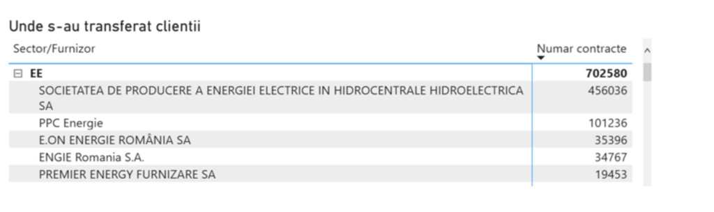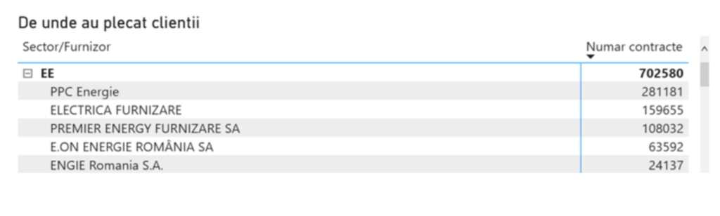 La polul opus, topul furnizorilor care au pierdut cei mai mulți clienți este PPC Energie – 281.181 (mai mulți decât a câștigat), urmat de Electrica Furnizare (159.655 clienți), Premier Energy (108.032), E.ON Energie (63.592) și Engie România, care a rămas fără 24.137 utilizatori.