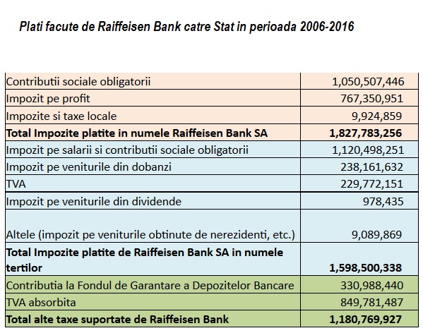 „Va trimit informatiile referitoare la impozitele platite de Raiffeisen Bank (direct si indirect), in perioada 2006-2016. Unele impozite si taxe sunt platite pe baza activitatiilor noastre si mai sunt si unele taxe pentru care noi suntem doar intermediarii (venitul obtinut este al clientilor/colaboratorilor iar noi avem doar obligatia de retinere la sursa si plata la bugetul de stat). Chiar si cele platite in numele tertilor sunt, in mod indirect, generate de activitatea bancii (salarii, dobanzi, dividende platite de banca)”, ne-au transmis reprezentantii Raiffeisen.