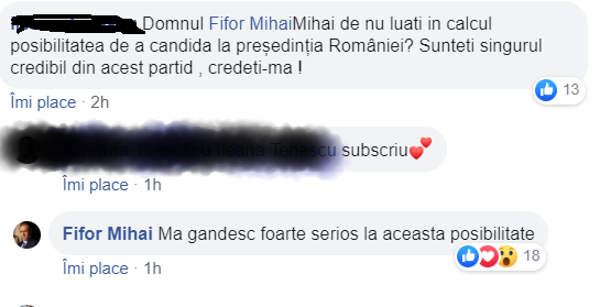 Întrebat de o utilizatoare Facebook de ce nu ia în calcul posibilitatea de a candida la președinția României, ”pentru că este singurul credibil din acest partid”, Fifor a răspuns: Mă gândesc serios la această posibilitate”.