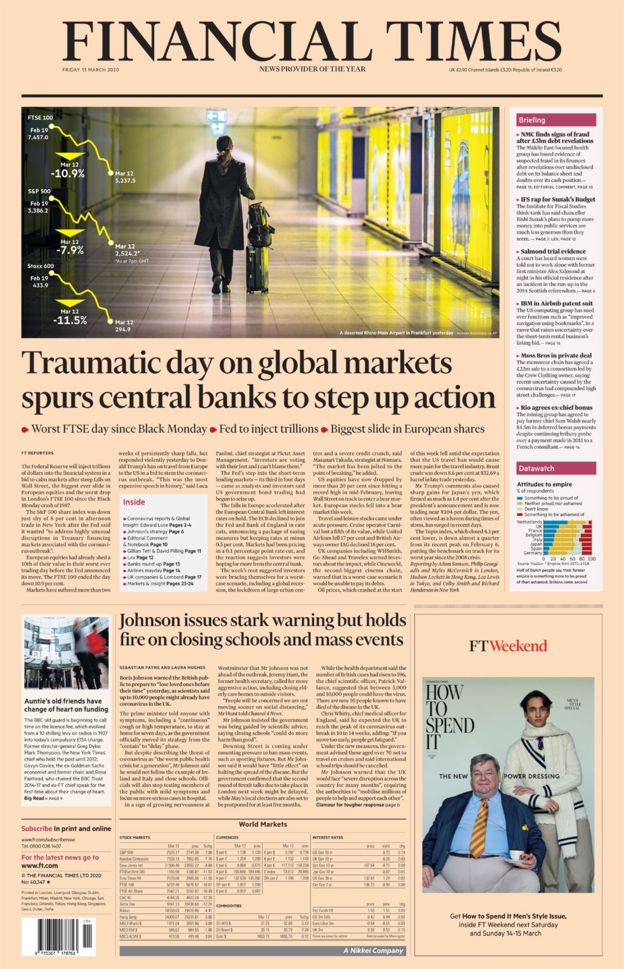 Financial Times: Cel mai scump discurs din istorie. Bursa americană a scăzut joi cu 10% în cea mai proastă zi de la prăbușirea din 1987 ● La Tribune: Cum a îngenuncheat coronavirusul economia mondială ● Mediapool: Nu există noi cazuri de coronavirus în Bulgaria. Șoferii din transportul în comun nu vor mai vinde bilete ● Știri pe scurt.
