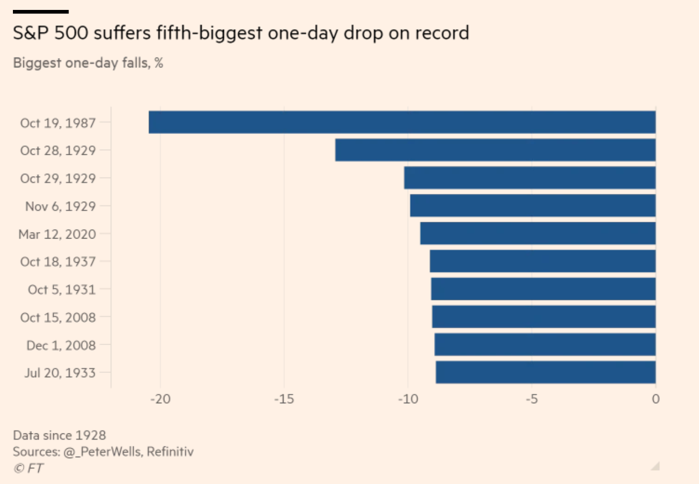 Financial Times: Cel mai scump discurs din istorie. Bursa americană a scăzut joi cu 10% în cea mai proastă zi de la prăbușirea din 1987