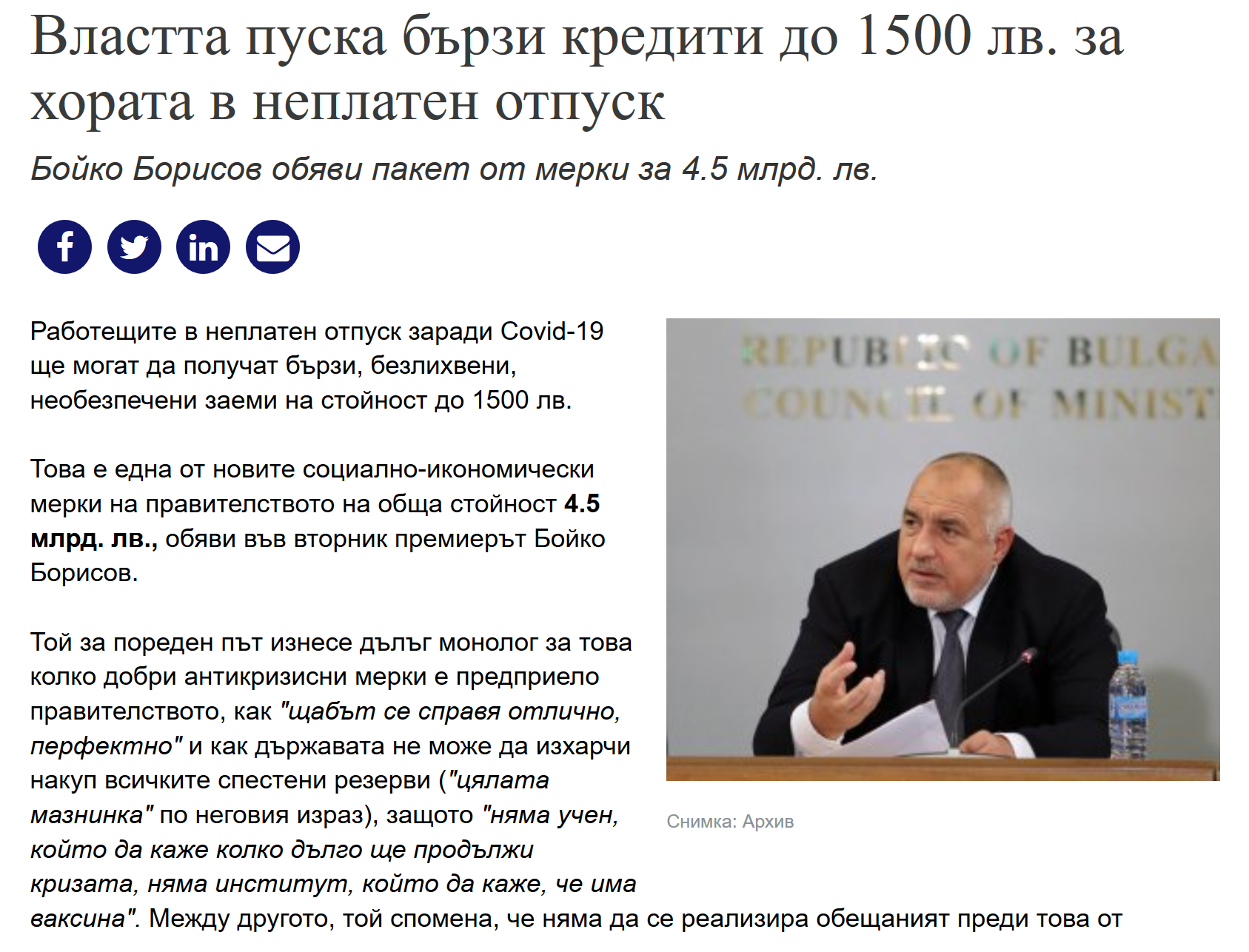 Potrivit spuselor lui Borisov, valoarea totală a măsurilor socio-economice ale cabinetului este de 4,5 miliarde de leva. Pe lângă garanțiile la Banca de Dezvoltare din Bulgaria, o altă sumă mare va merge pentru măsura anunțată „60:40”, în care statul va prelua 60% din salariile angajaților din întreprinderile închise de stat din cauza măsurilor antiepidemiologice. Este vorba de peste 1 miliard de leva, a anunțat Borisov. În timpul briefingului nu a fost vorba despre extinderea mecanismului, după cum insistă întreprinderile și sindicatele. Acestea sunt îngrijorate că măsura în forma sa actuală va sprijini foarte puțini lucrători și companii.