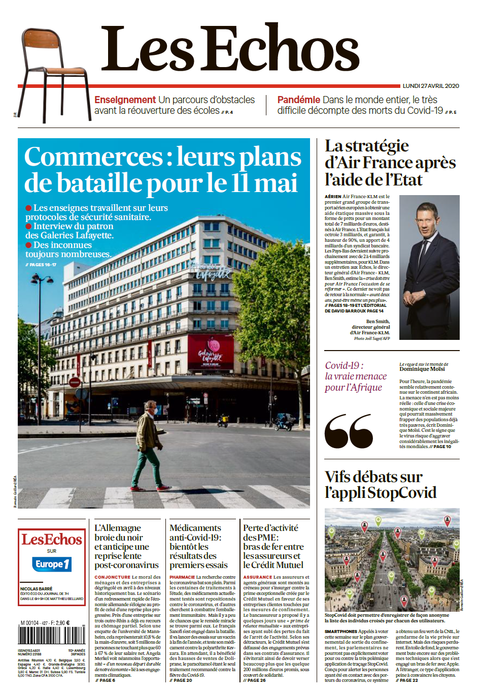 Franța se află în a șasea săptămână de blocaj destinat prevenirii răspândirii coronavirusului, acesta provocând până acum 22.600 de decese. În această lună, însă, numărul de persoane aflate la terapie intensivă a scăzut constant. Țara se va redeschide treptat începând cu 11 mai, fără a se fi luat vreo decizie cu privire la soarta barurilor și restaurantelor, decizie care urmează a fi luată cel mai devreme la sfârșitul lunii viitoare.