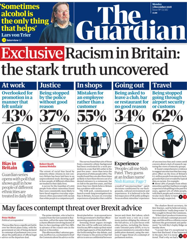 „Rasismul și discriminarea nu se limitează la un anumit domeniu al vieții”, a declarat Zubaida Haque, directorul adjunct al trustului care a efectuat sondajul. „Dacă nu sunteți binevenit într-un restaurant ca oaspete datorită culorii pielii, este puțin probabil să obțineți un loc de muncă în restaurant din același motiv. Rasismul structural și instituțional este dificil de identificat sau dovedit, dar are efecte mult mai profunde asupra vieții oamenilor „.