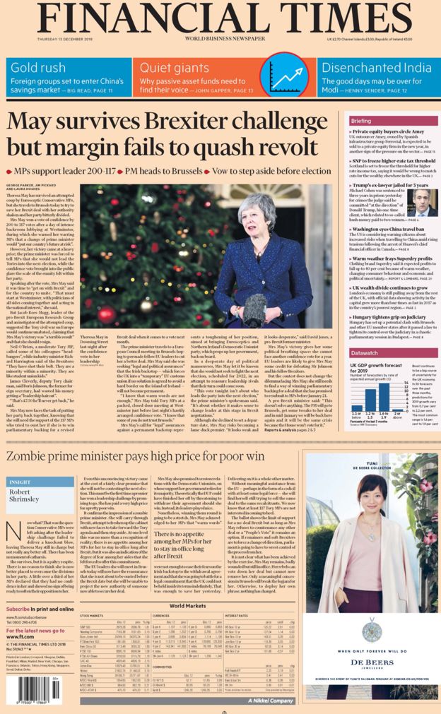- Financial Times: Theresa May a supraviețuit votului de încredere, dar autoritatea ei a fost serios zdruncinată, iar partidul rămâne divizat
