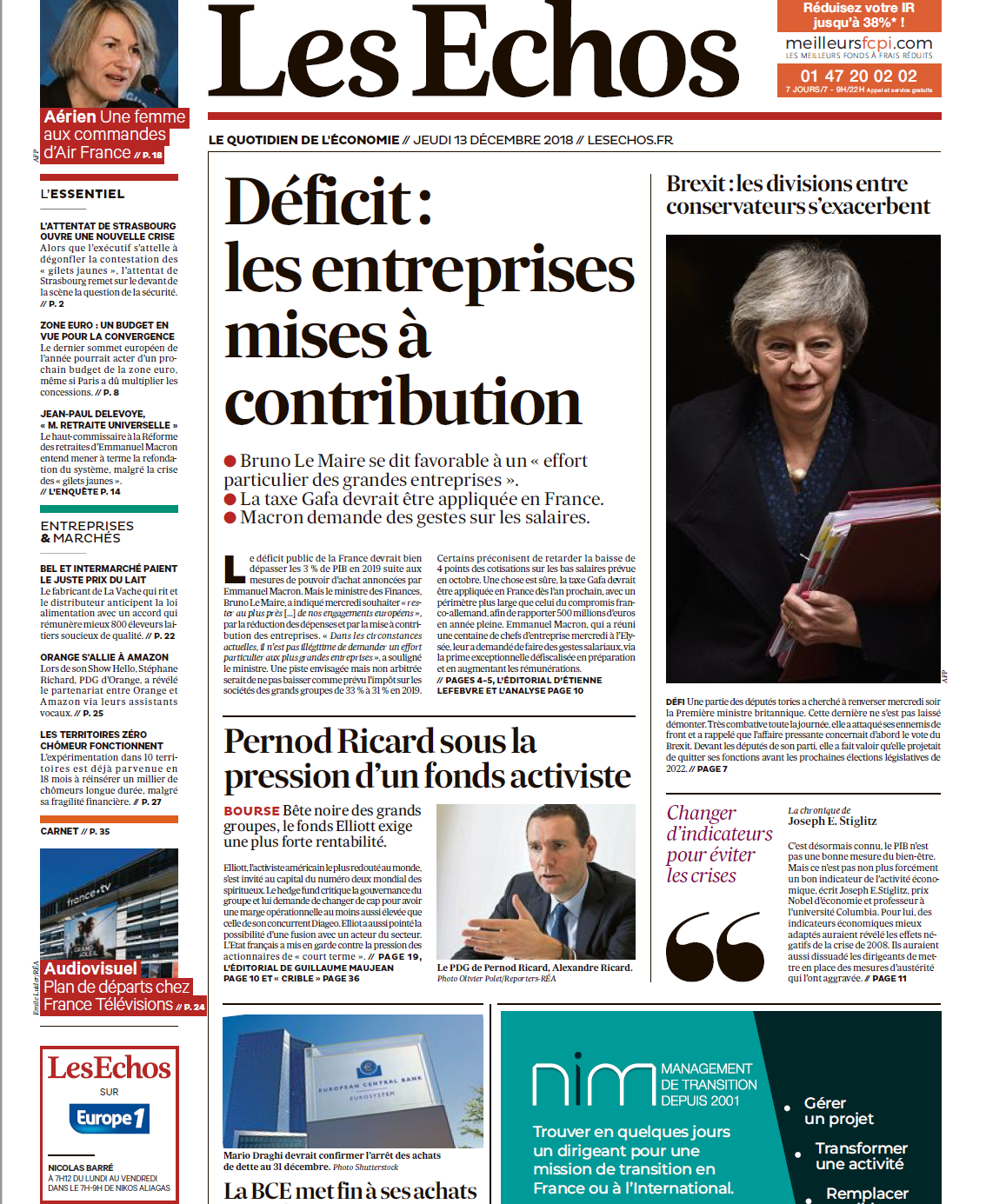 Financial Times: Theresa May a supraviețuit votului de încredere, dar autoritatea ei a fost serios zdruncinată, iar partidul rămâne divizat● Virajul costisitor de 180 de grade al lui Macron pune la încercare fermitatea UE în privința Italiei ● Les Echos. Joseph Stiglitz: Trebuie să măsurăm mai bine economia pentru a putea evita viitoarele crize● L Echo: Puterea de cumpărare a crescut în ultimii 20 de ani ● Handelsblatt: Marile firme nemțești se pregătesc pentru următoarea criză adoptând deja programe de austeritate. Lectură plăcută!