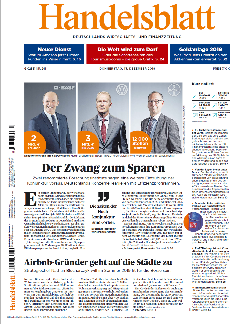 Cu toate acestea, conflictul comercial lansat de președintele american Trump, scăderea produsului intern brut în Germania din al treilea trimestru și datele economice tot mai slabe din regiunile importante ale lumii lasă urme tot mai profunde. Douăsprezece dintre cele 30 de companii incluse în indicele bursier Dax au publicat prognoze prudente pentru 2019. Inclusiv BASF , Bayer , Henkel , Fresenius și producătorii de automobile BMW și Daimler.