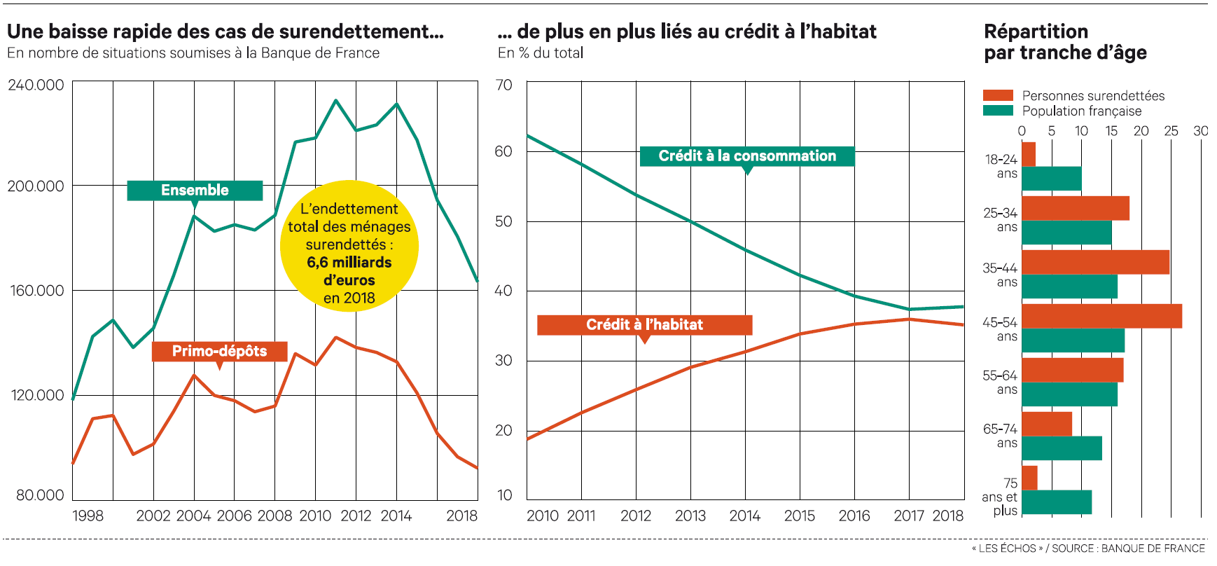 Acest progres nu este fără îndoială independent de îmbunătățirea climatului economic și de costul redus al creditului în ultimii ani. Dar specialiștii văd în contracția acestor cifre beneficiile supravegherii distribuirii creditului de consum. Eficacitatea legilor Lagarde (2010) și Hamon (2014) a dus la scăderea ponderii creditului de consum la sub 40% din total credit, după ce în 2010 acesta depășise 60% în 2010. „Aceasta este o schimbare fundamentală“ insistă Stéphane Tourte de la Banque de France. Acum, în peste un caz din cinci, persoana supraîndatorată nu are credit de consum.