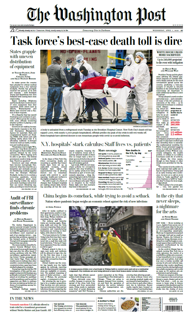 - În SUA, decesele cauzate de coronavirus „ar putea atinge punctul culminant pe la mijlocul lunii aprilie chiar dacă toate statele impun restricții”, scrie USA Today. Potrivit unui studiu elaborat de Universitatea din Washington, chiar dacă întreaga țară va depune toate eforturile pentru a restricționa orice fel de contacte, numărul deceselor cauzate de coronavirus se vor înmulți în următoarele două săptămâni, iar bolnavii vor umple spitalele din majoritatea statelor. Spre sfârșitul verii, numărul americanilor decedați ar putea fi de 84.000, potrivit studiului citat de USA Today. Cifrele sunt oricum mai puțin pesimiste decât cele anunțate anterior de președintele Donald Trump, care a avertizat că urmează două săptămâni foarte grele și că în cel mai optimist scenariu, numărul deceselor ar putea ajunge la 200.000. Site-ul Politico remarcă o schimbare radicală în atitudinea președintelui american, spunând despre acesta că a renunțat să mai minimizeze impactul coronavirusului. „O fi el, președintele, încăpățânat și belicos, dar până și el știe să se oprească atunci când înțelege că pierde simțul real al războiului. Nu putem decât să ne imaginăm la ce scamatorii au recurs consilierii Anthony Fauci și Deborah Birx în fața lui Trump ca să-l convingă să renunțe la ideea relaxării restricțiilor datorate coronavirusului”, mai arată Politico.