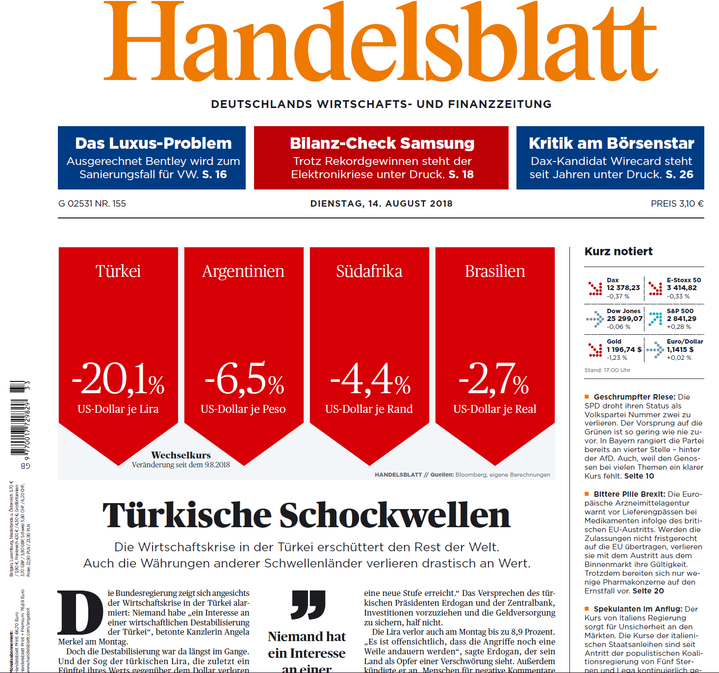 - HANDELSBLATT- Undele de șoc turcești. Criza economică din Turcia agită restul lumii. Monedele țărilor emergente își pierd, de asemenea, valoarea