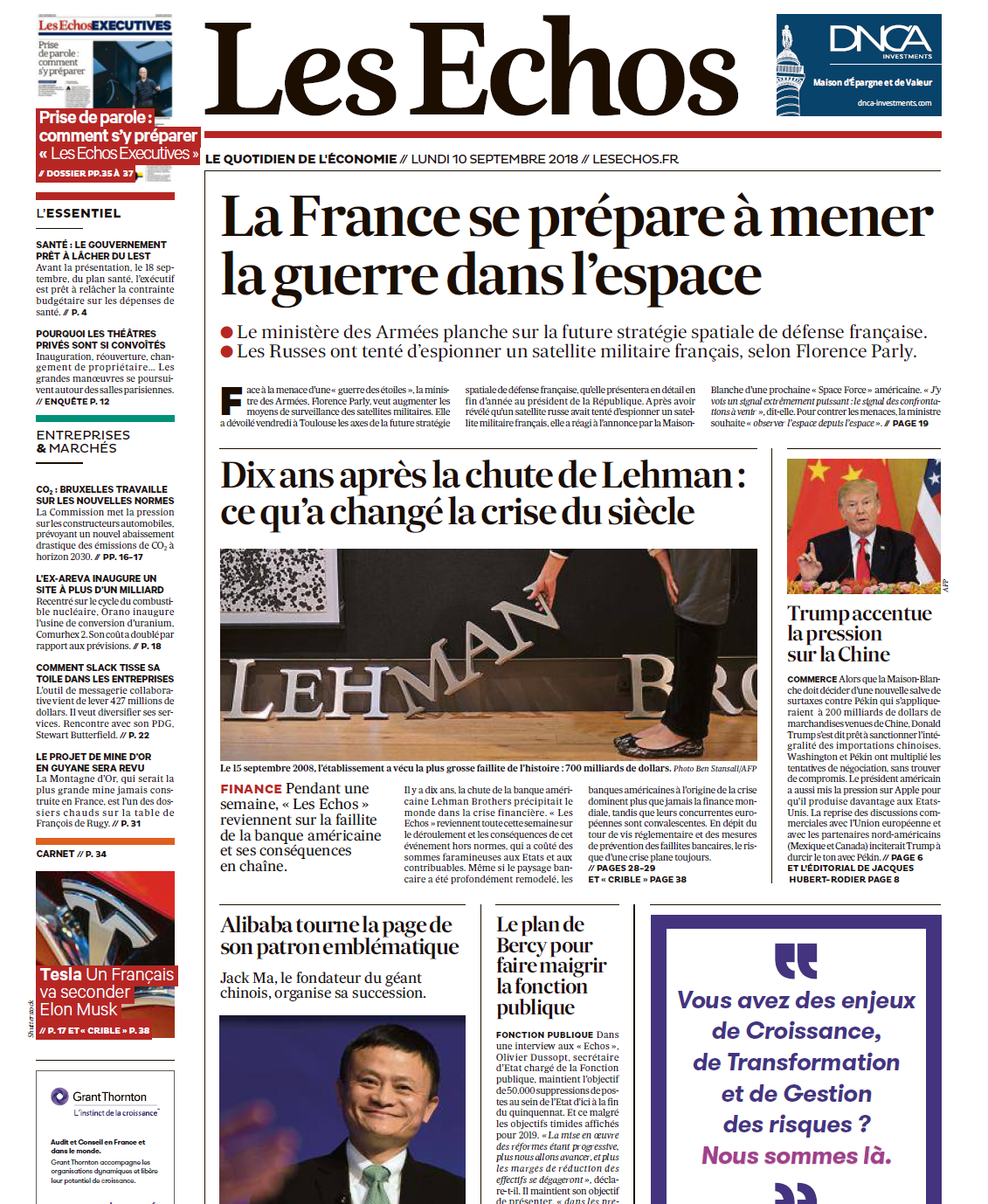 În 10 întrebări și răspunsuri, paginile 28 și 29 sunt dedicate celor 10 ani de la prăbușirea Lehman. Les Echos va relua în această săptămână subiectul ”crizei secolului”, cum o numește, încercând să explice de unde a pornit totul, cum s-a propagat, ce s-a schimbat de atunci, dar și ce a mai rămas de schimbat.