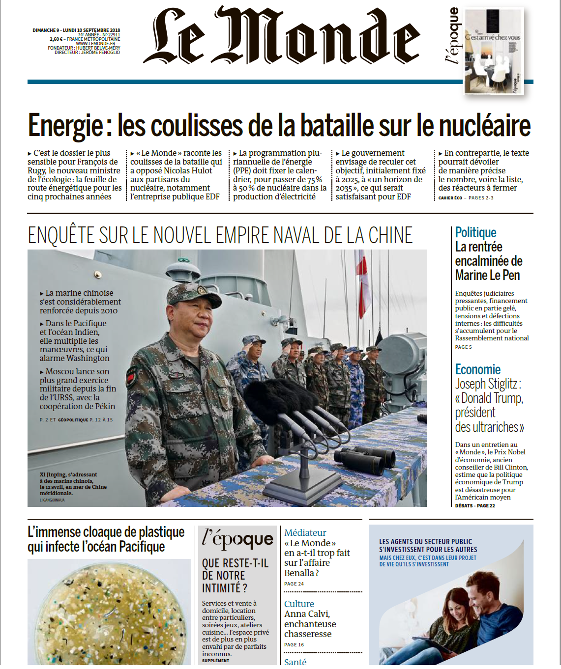 Zeci de distrugătoare și fregate care înconjoară un portavion navighează în largul insulei, din Marea Chinei de Sud. În urma lor submarinele, cu stegulețele roșii care flutură deasupra turelelor. Aflat lângă un distrugător de rachete Changsha, președintele chinez, Xi Jinping, salută. „Bună ziua, tovarăși!”. Soldații iau poziția de drepți. Forța marină a Chinei a crescut cu mult peste necesarul apărării teritoriului țării ori a controlul mărilor Chinei.