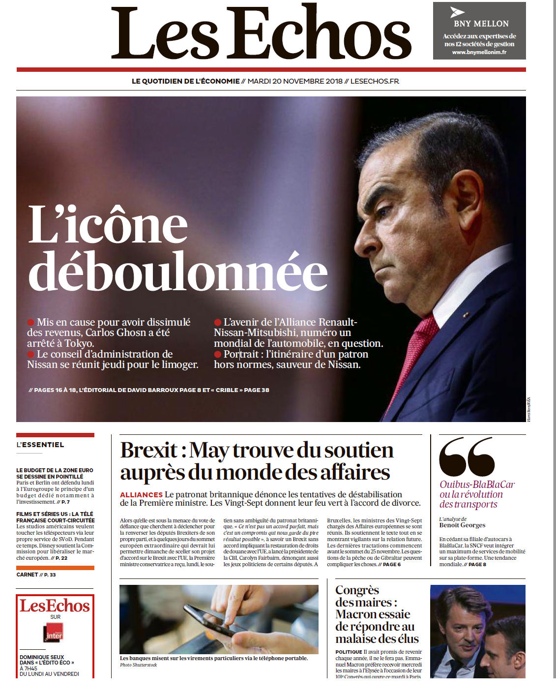 Les Echos deschide, așa cum e și firesc, cu cazul Ghosn. Întrucât am preluat textul din FT despre acest caz, din Les Echos vă oferim un alt text.