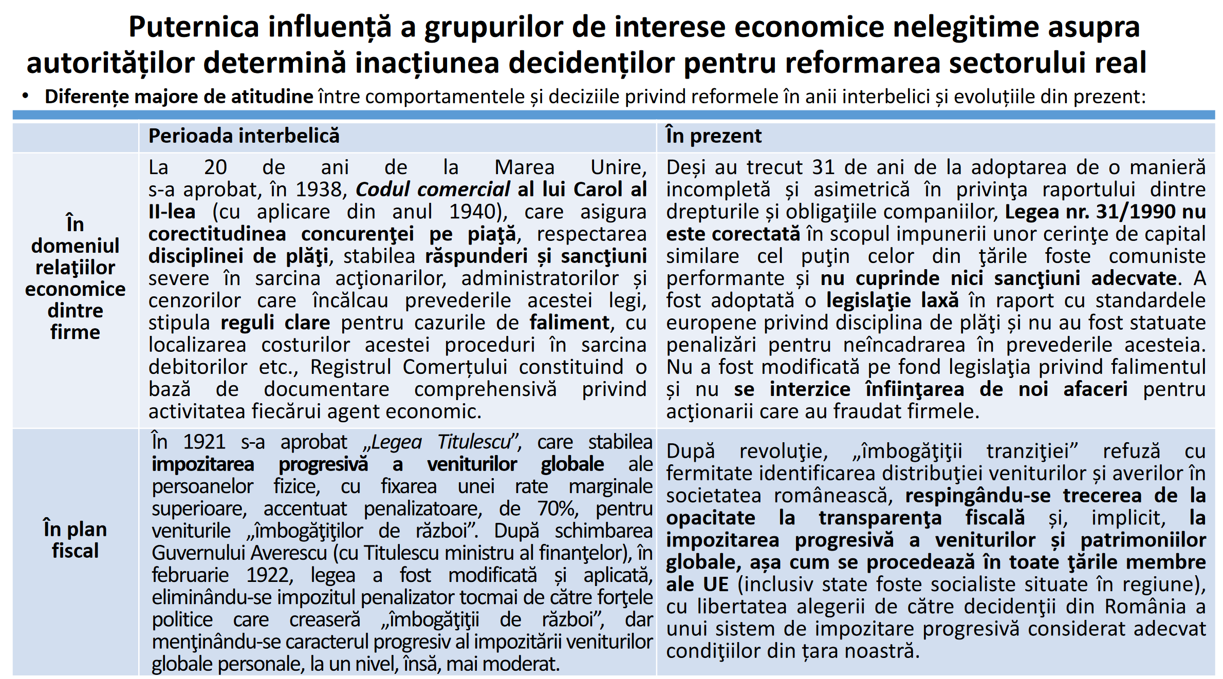 Dincolo de originile obscure și ilegale, în mare parte, ale capitalului, opoziția grupurilor de interese ilegitime față de racordarea legislației comerciale și fiscale la cerințele unei economii de piață pe deplin funcționale este cauzată și de lipsa de transparență privind ideologia și conținutul reformelor aplicate pe parcursul tranziției.