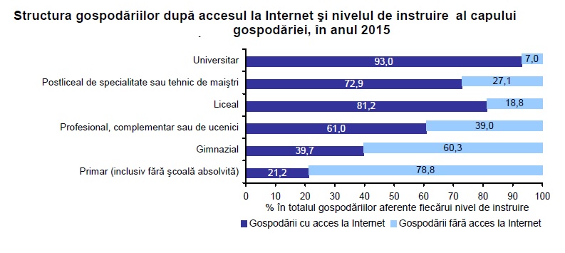In 2015, conectarea la Internet a fost mai raspandita in cadrul gospodariilor din regiunea Bucuresti-Ilfov (peste 3 din 4 gospodarii aveau acces la Internet de acasa), urmata la mare distanta de regiunile Vest, Nord-Vest, Centru, Sud-Vest Oltenia si Sud-Muntenia.