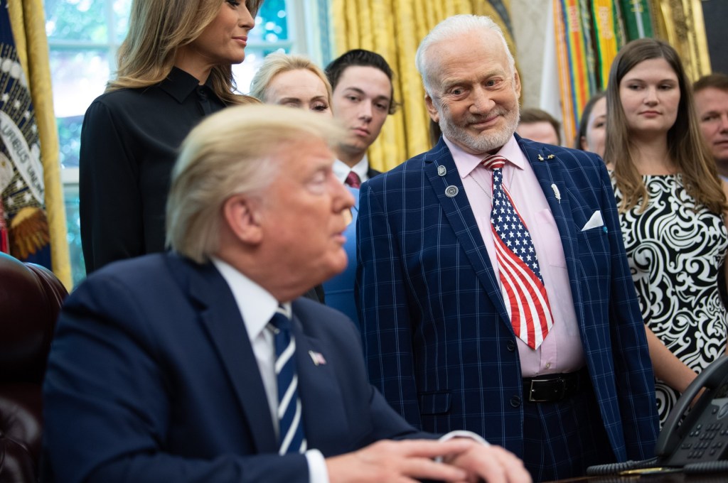 Aldrin, un fost comandant al Şcolii de piloţi de testare a Forţelor Aeriene americane (US Air Force) consideră că „America a cunoscut o recâştigare a interesului faţă de spaţiu” în mandatul lui Trump mulţumită reînfiinţării în 2017 a Consiliului Naţional american al Spaţiului, dizolvat în 1993, şi înfiinţării U.S. Space Force la 20 decembrie 2019.