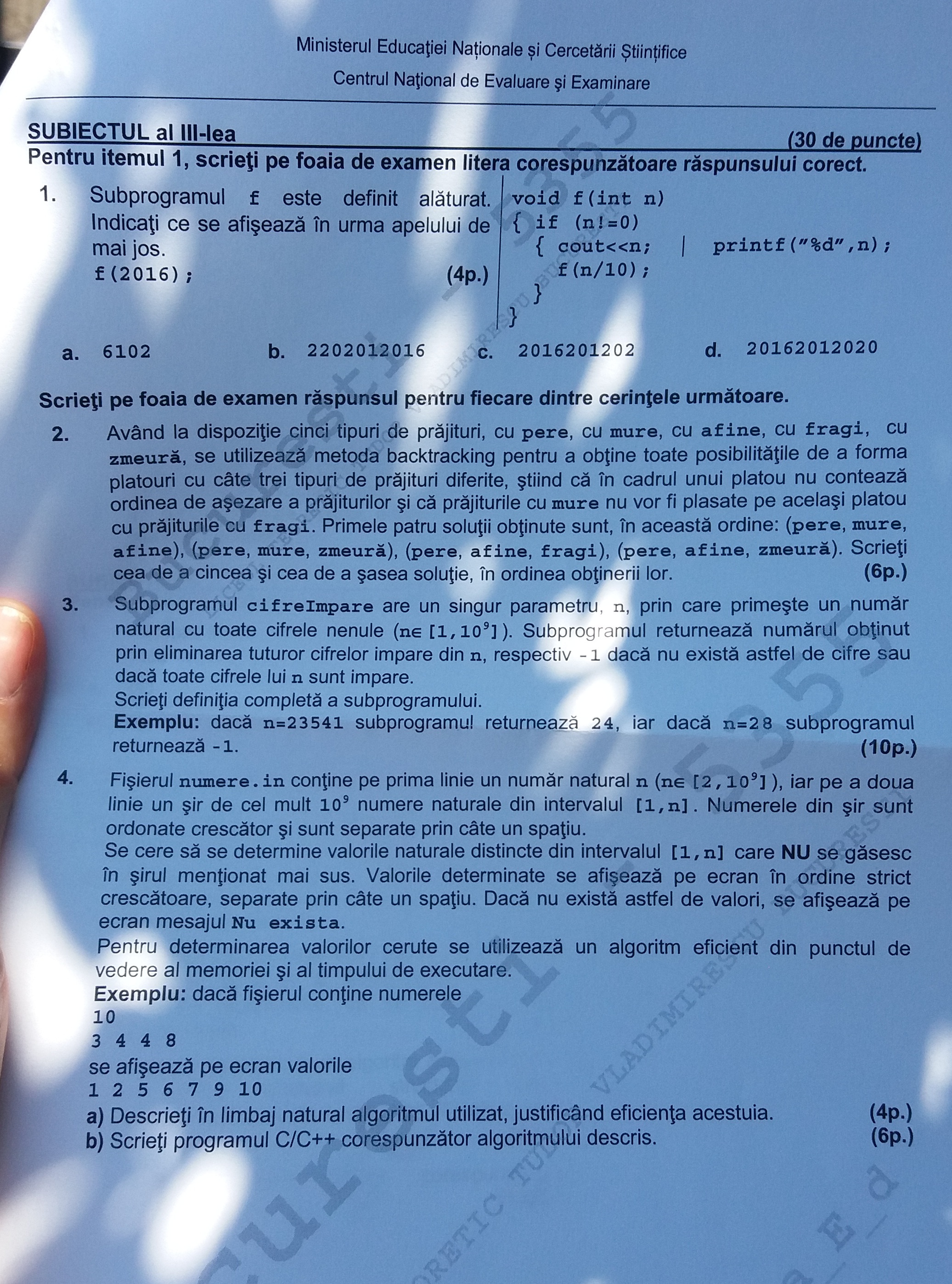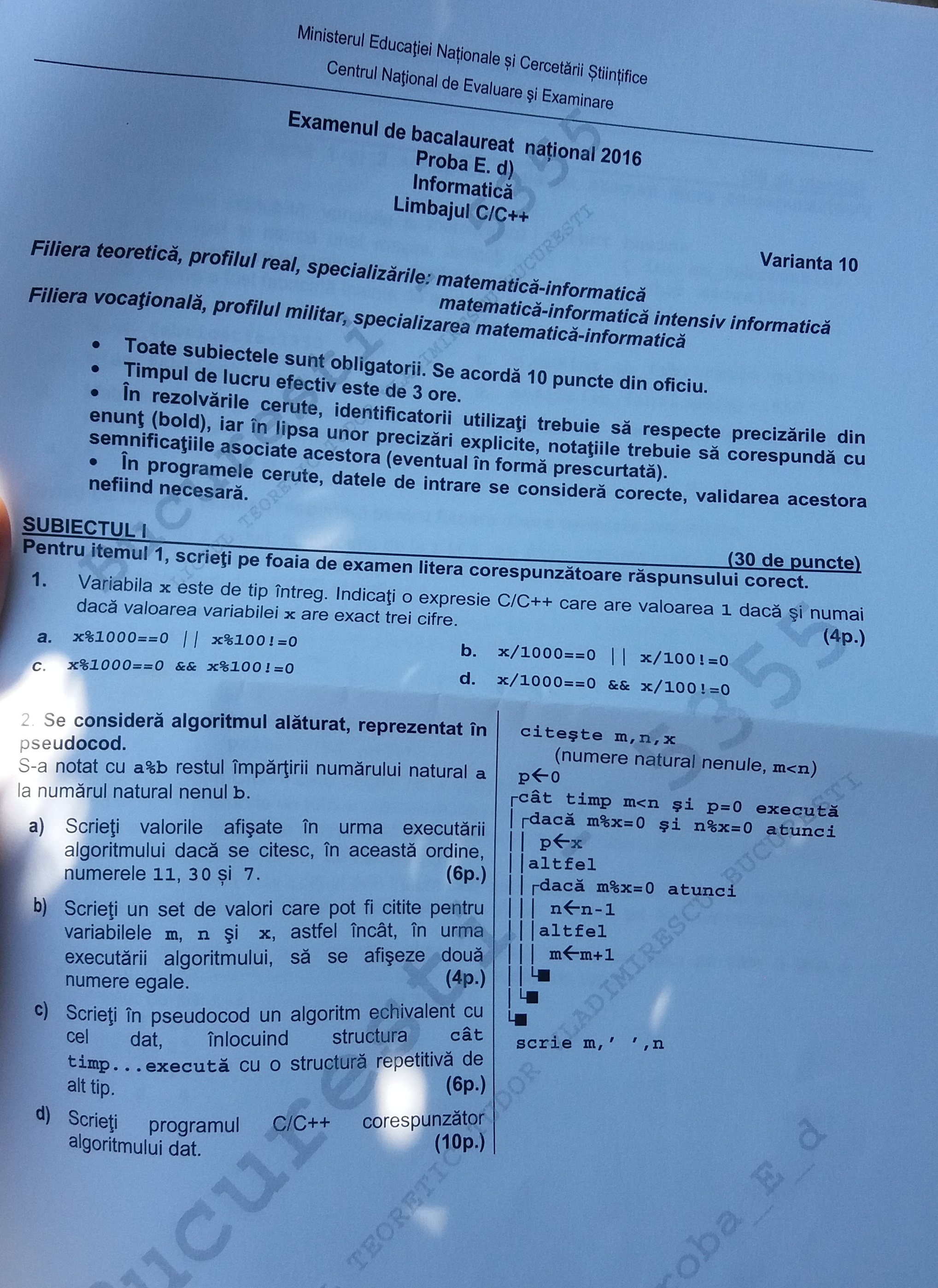 FOTO Bacalaureat 2016 – Subiectele si baremul la proba la alegere: Informatica – Limbajul C/C++