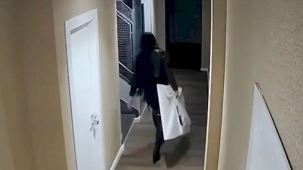 Potrivit imaginilor de pe camerele de supraveghere, femeia a plecat cu televizorul din apartament învelit într-o lenjerie de pat, dar și cu un airfryer, scrie site-ul Observator, citat de B365.ro.
