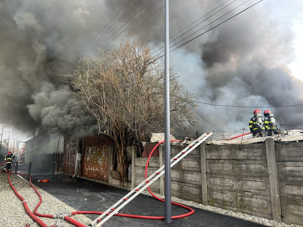 FOTO Incendiu la o hală de vopsitorie auto din Sibiu. Zeci de persoane evacuate din imobilele învecinate