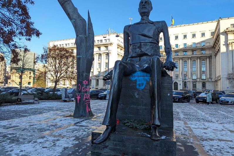 FOTO „Memorialul Renașterii” din Piața Revoluției, vandalizat. Nu este singurul monument din centrul Capitalei pe care au fost scrise mesaje obscene
