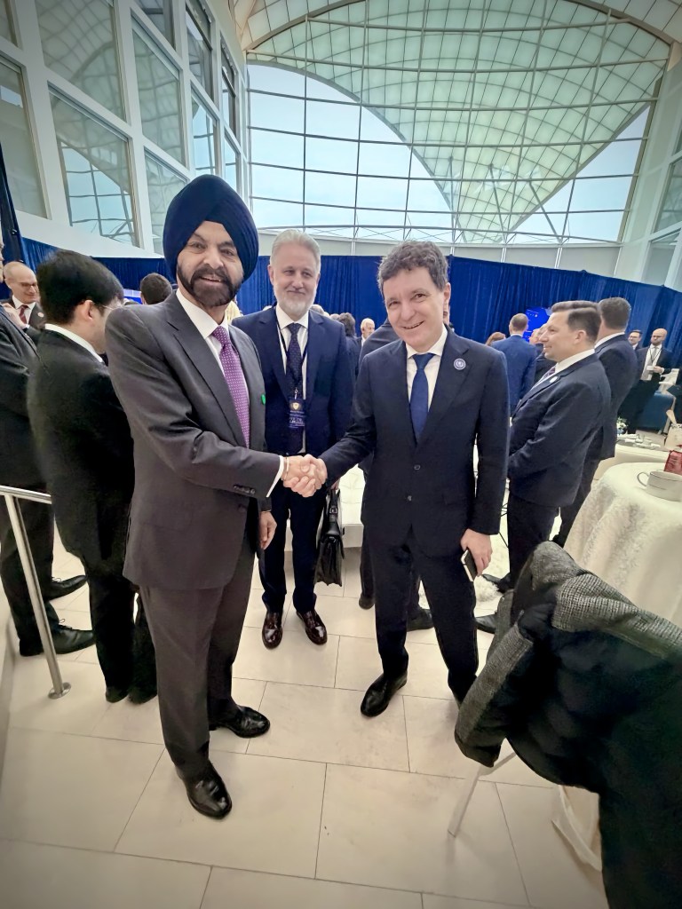 Înainte de începutul reuniunii, șeful statului s-a fotografiat alături de Javier Milei, președintele Argentinei, de Tony Blair și de președintele Băncii Mondiale.
