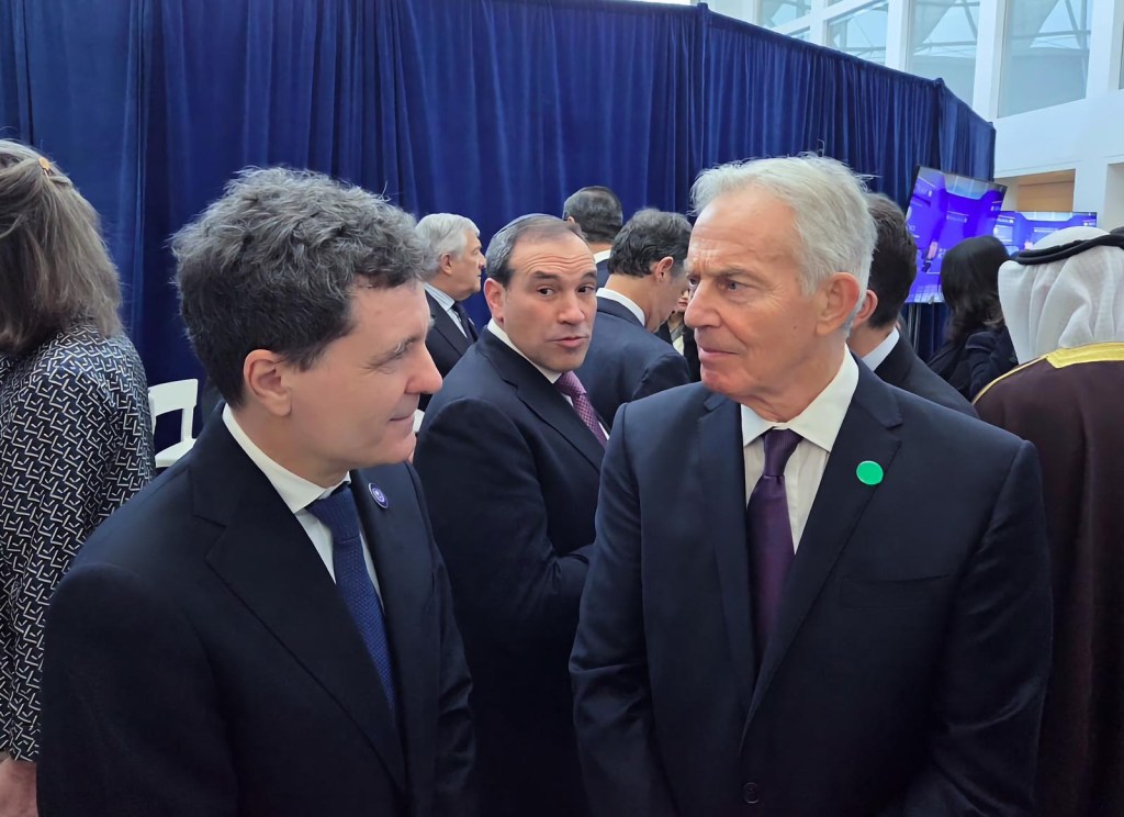 Nicușor Dan stă în partea stângă a sălii, în capătul rândului din mijloc, chiar lângă Tony Blair, fost premier laburist al Marii Britanii.
