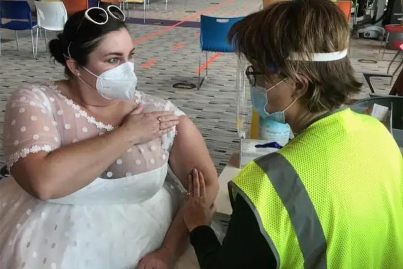 Pentru a face haz de necaz, Studley a hotărât să își poarte rochia de mireasă la centrul de vaccinare din orașul Baltimore, Maryland, unde s-a inoculat săptămâna trecută.