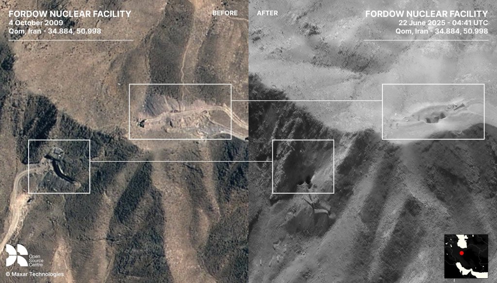 Primele imagini din satelit surprinse de la Fordow, unde se află cele mai importante instalații nucleare ale Iranului, arată distrugeri de amploare, prin comparație cu fotografiile realizate în 2009, atunci când situl se afla încă în construcție, susține Open Source Centre, o organizație din Marea Britanie care face analize de securitate pe baza informațiilor obținute din surse deschise.