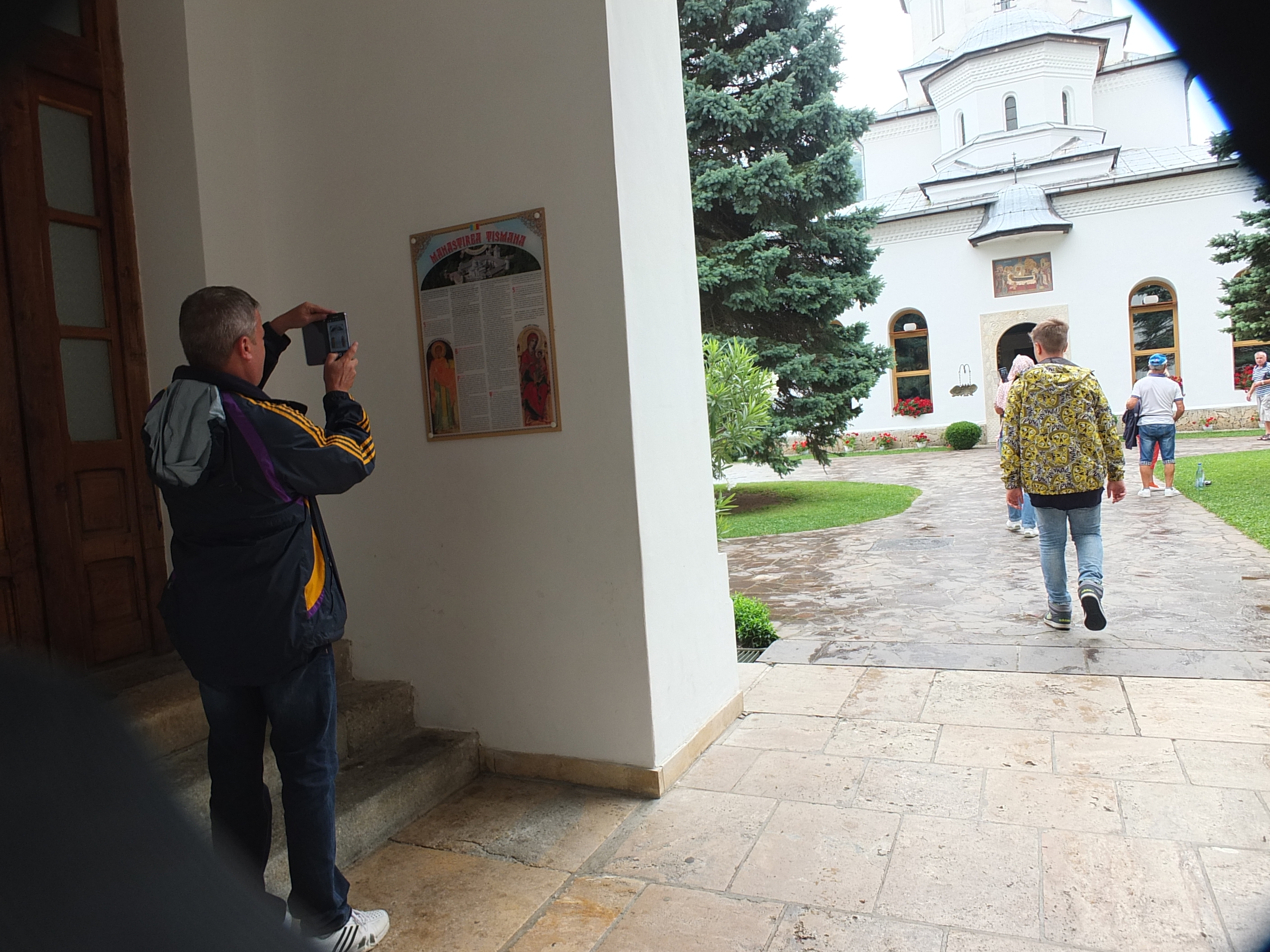 ”Da-mi draga telefonul ala ce stai asa”, ii spune un altul, consoartei.Ea cauta telefonul in geanta, nu da de el, el se enerveaza („…ce ce e si in geanta aia a ta…”), ea pleaca privirea si se pune iar pe cautat, el bate din picior, ea zambeste si-l priveste duios. L-a gasit! Isi vor putea face un selfie cu Credinta si Sfintenia. La doi pasi de ei, un alt turist fotografiaza un pliant expus pe perete. De vreo trei ori, ca nu se stie….