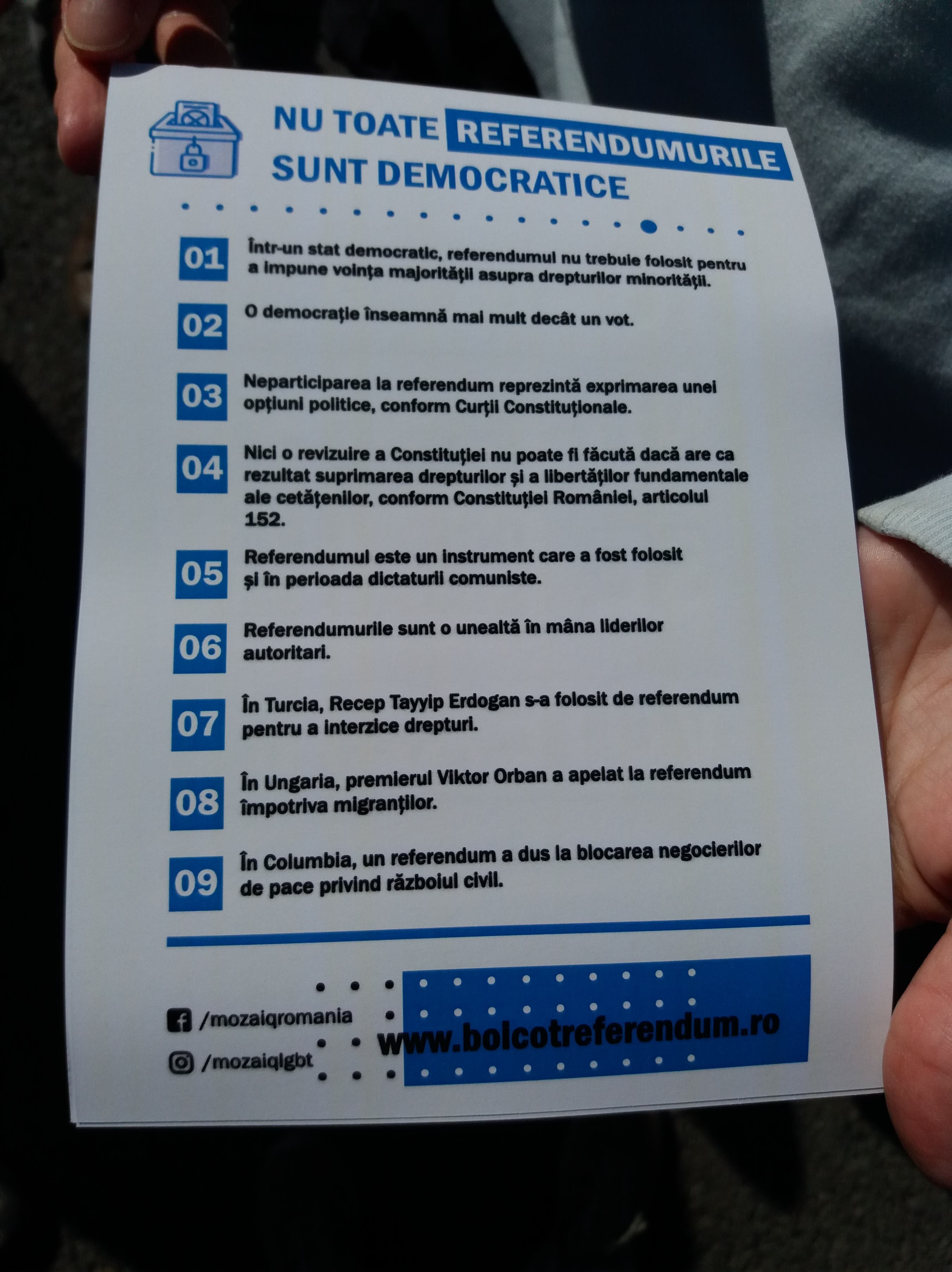 În cadrul manifestației s-au împărțit pliante în care sunt explicate motivele pentru care ar trebui ca lumea să nu participe la referendum.