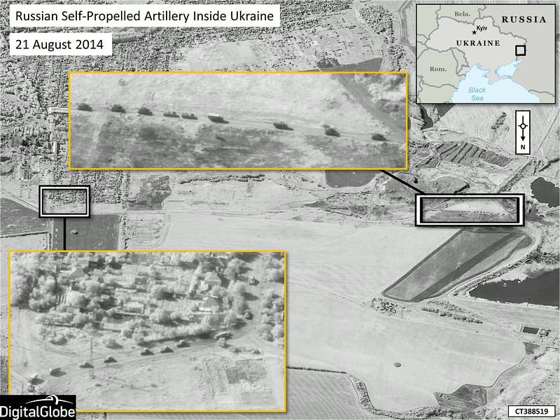 NATO a difuzat joi noi fotografii din satelit care arata, sustine Alianta, fortele combatante ruse angajate in operatiuni militare pe teritoriul Ucrainei. Imaginile, surprinse la sfarsitul lunii august, infatiseaza unitati de artilerie autopropulsata care se deplaseaza in covoi pe teritoriul ucrainean, iar apoi se pregatesc de actiune stabilind pozitii de tragere in zona orasului Krasnodon din Ucraina.