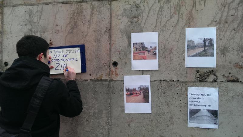 Cetatenii care au participat duminica la protest au lipit pe zidul de beton mesaje prin care cer Primariei sa stopeze betonarea spatiilor verzi si au aprins lumanari spunand ca zidul de beton le aduce aminte de zidul Berlinului.