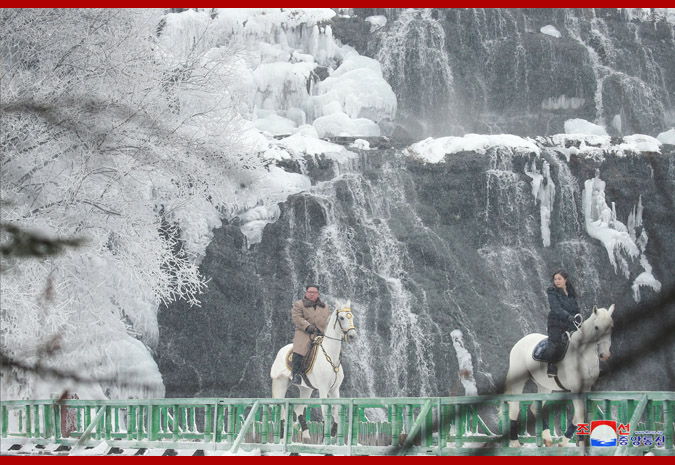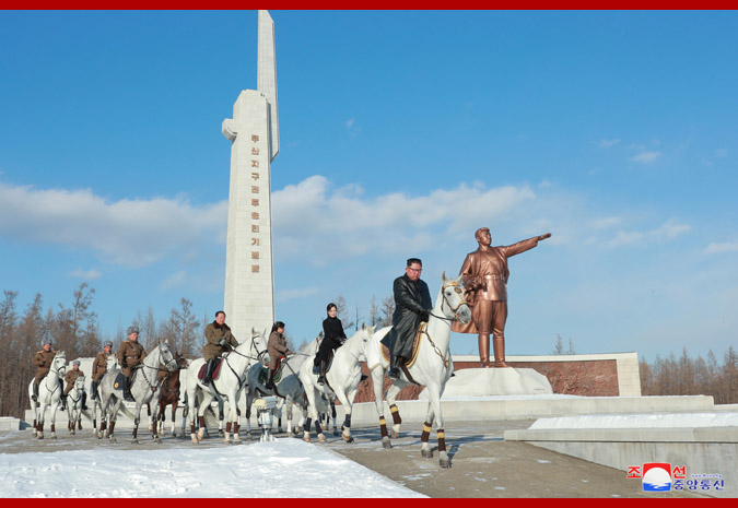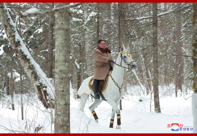 Kim Jong Un a fost fotografiat în fruntea unui grup de călăreţi într-o pădure înzăpezită în apropiere de Muntele Paektu, vulcan adormit la frontiera dintre Coreea de Nord şi China.
