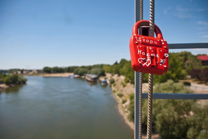 „Lacat al iubirii” fixat pe un pod din Tiraspol, deasupra Nistrului. Textul de pe lacat este „Igor+Nasta”