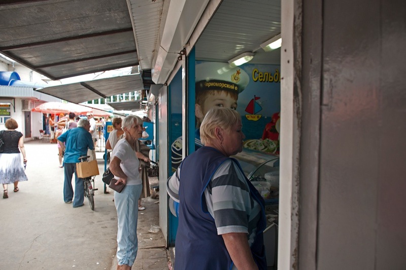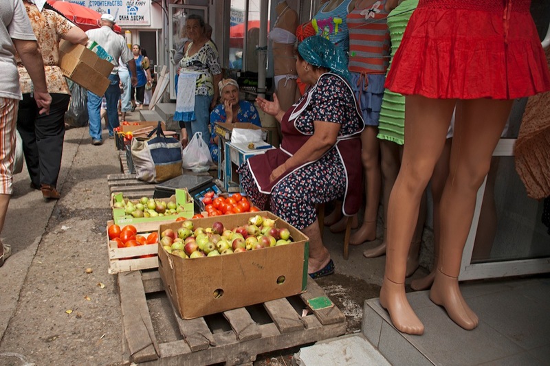 Iesim direct in harmalaia pietei. Totul se vinde la gramada: ferestre, fructe si fuste. Majoritatea vanzatorilor de legume si fructe sunt pensionari si vin de la periferia orasului cu produsele proprii. Transportul public in Transnistria e gratuit pentru pensionari, asa ca fiecare vinde ce are pe acasa pentru a-si intregi veniturile. Unii dintre ei isi aduc si nepotii la piata sa-i ajute.