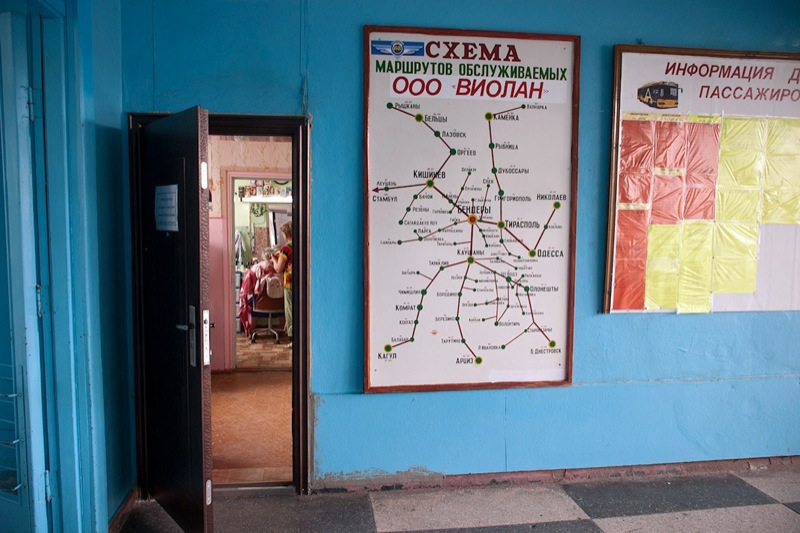 Harta rutelor de microbuz din autogara Bender (Tighina). In stanga, intrarea intr-o frizerie.