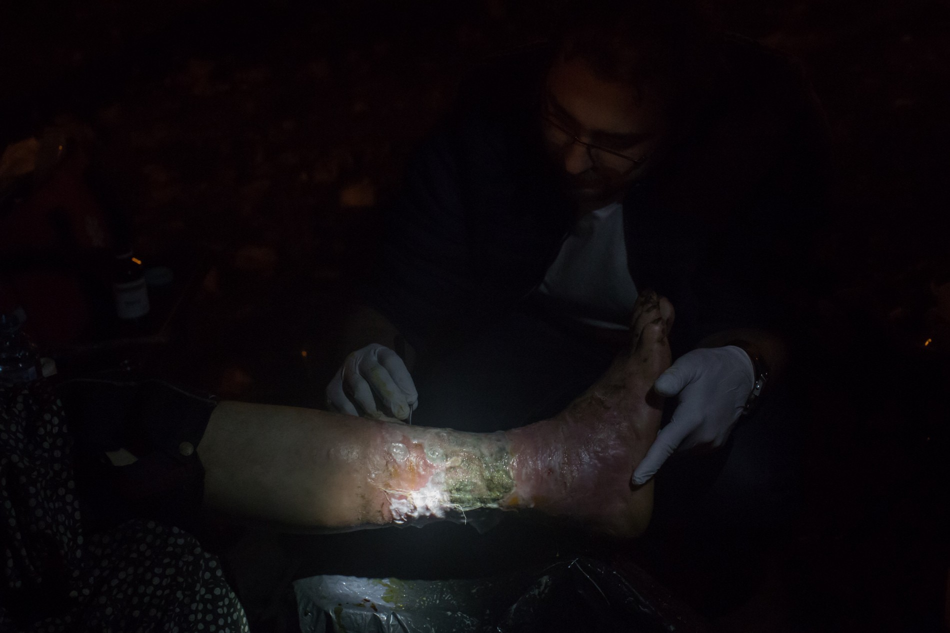 E deja întuneric, le trebuie o lanternă, doctorul începe să desfacă bandajele. Viermii nu mai apar, “arată mai bine”, zice Colin, în timp ce curăță și repansează, încercând să țină piciorul cât mai drept.