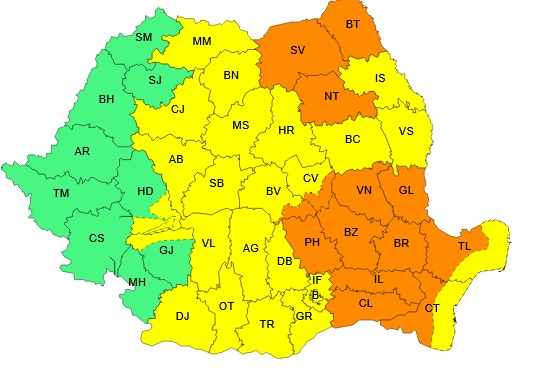 Un cod portocaliu de instabilitate atmosferică accentuată, valabil în perioada 17 iulie, ora 15 – 18 iulie, ora 03, vizează nordul și estul Munteniei, sudul Moldovei, sud-estul Transilvaniei și Dobrogea continentală.