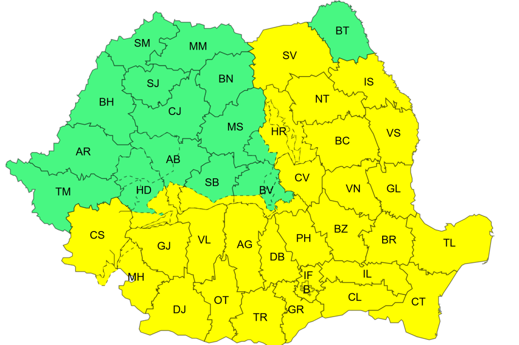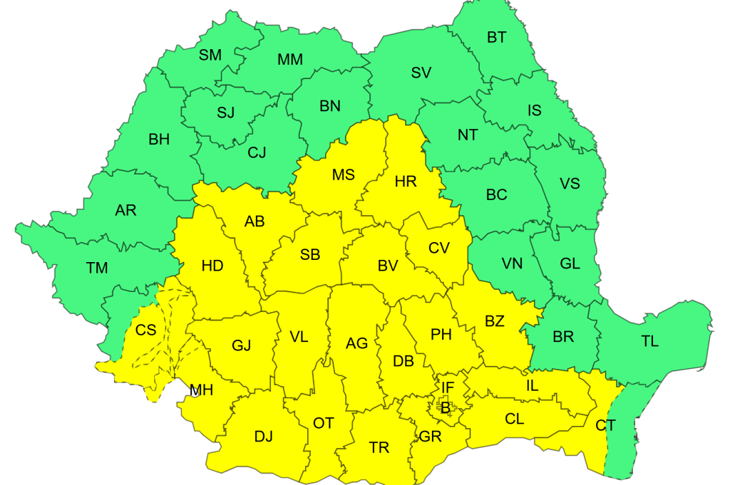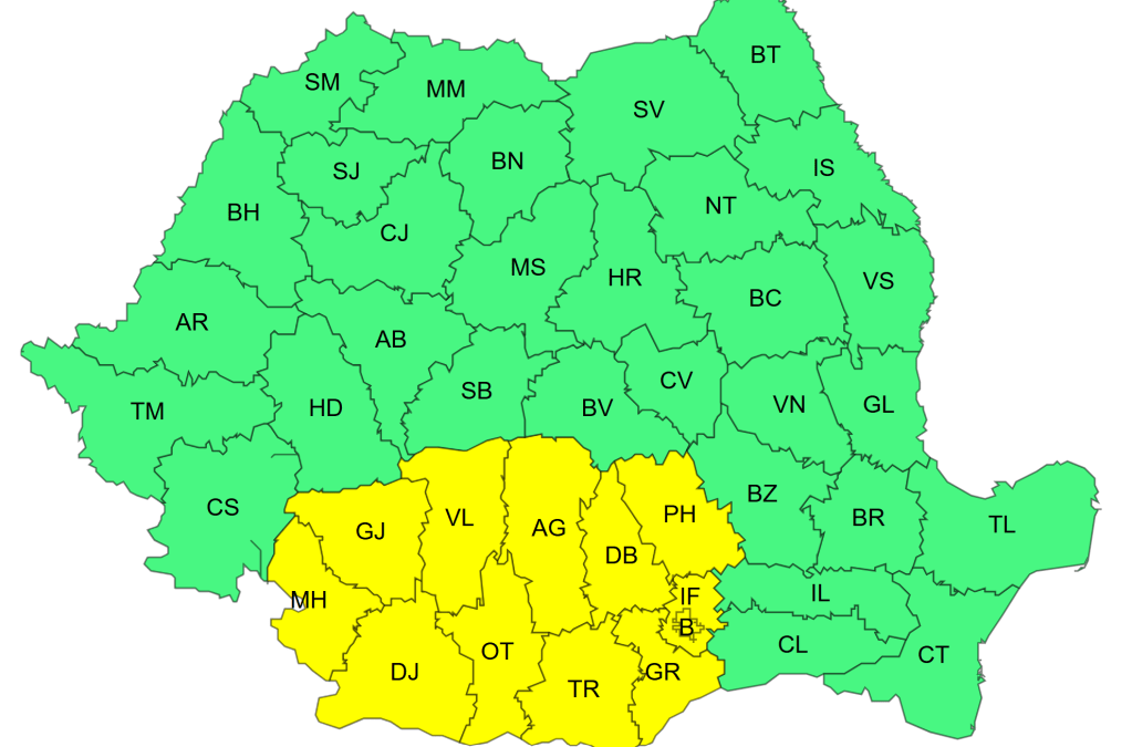 De asemenea, până diseară, la ora 22:00, este cod galben de vânt puternic în sudul Banatului, Oltenia, cea mai mare parte a Munteniei și Transilvaniei și sud-vestul Dobrogei.