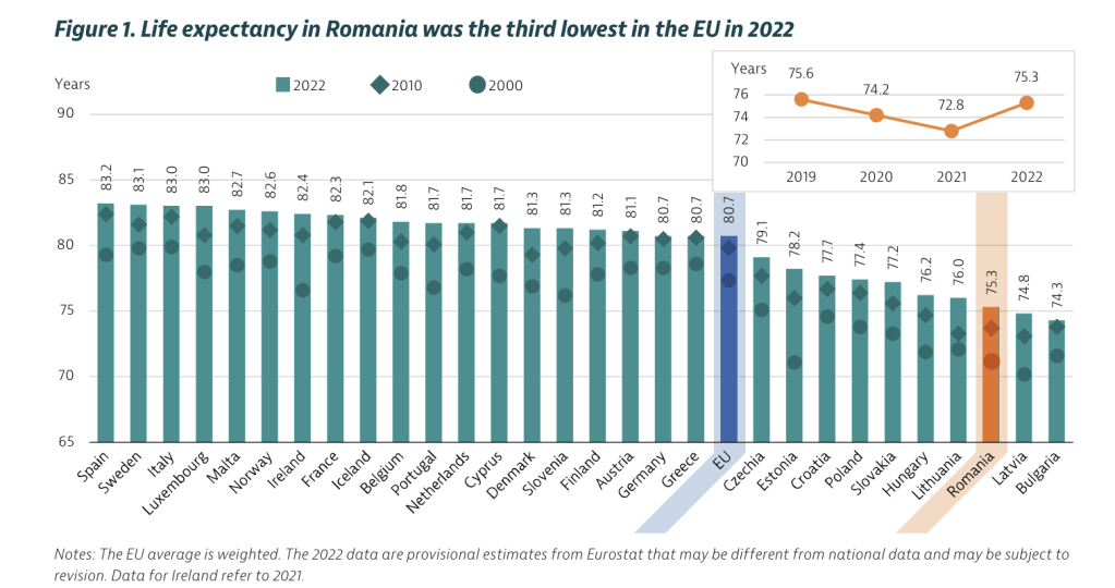 Caption: În 2022, România avea a treia cea mai scăzută speranță de viață din UE. Sursa: OECD