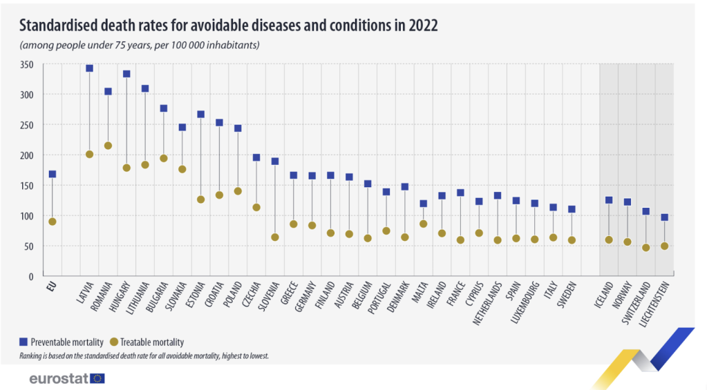 Caption: Ratele de mortalitate din cauze prevenibile la nivel european. Sursa: Eurostat
