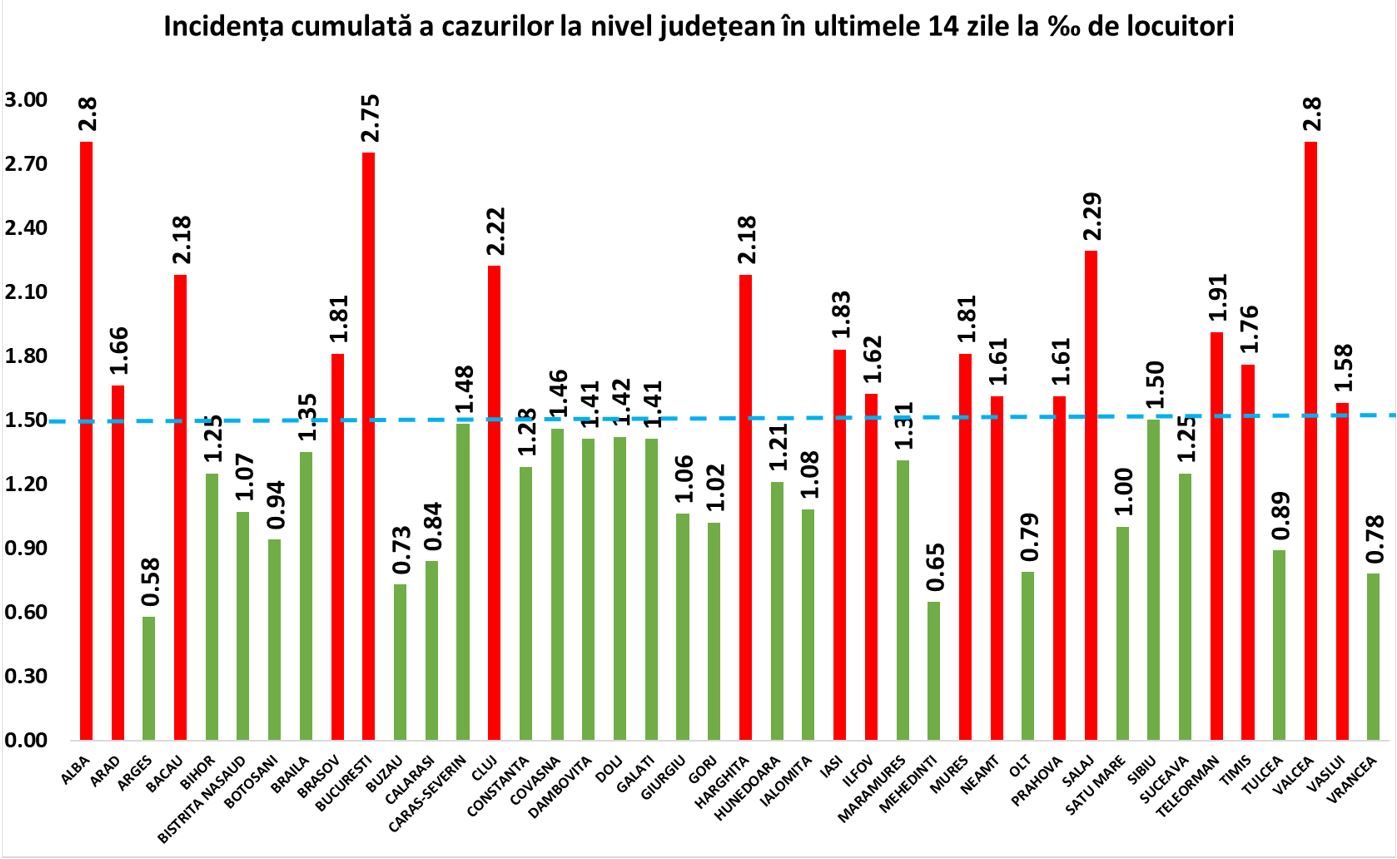 În schimb, două județe, Alba și Vâlcea, au ajuns la o incidență de 2,8, foarte aproape de limita care ar impune aplicarea de noi măsuri restrictive pe plan local.