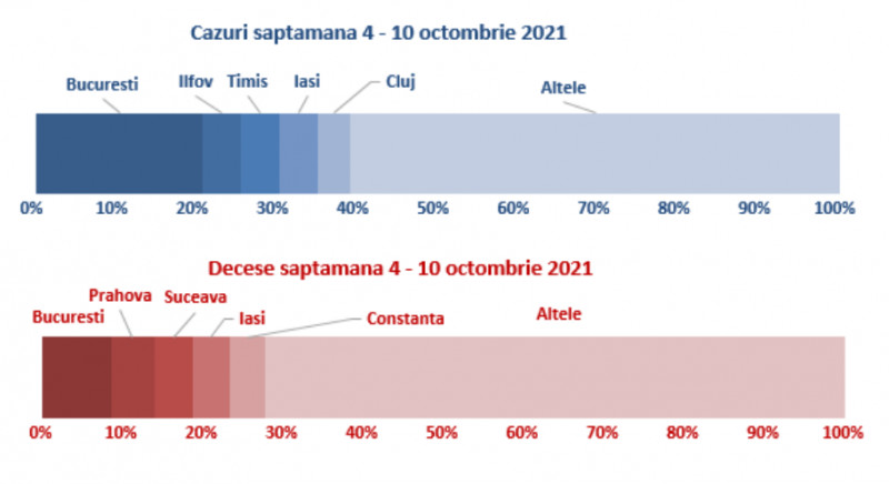GRAFIC Peste 91% din decesele COVID din ultima săptămână au fost la persoane nevaccinate. Peste un sfert, în București și în 4 județe – raport INSP