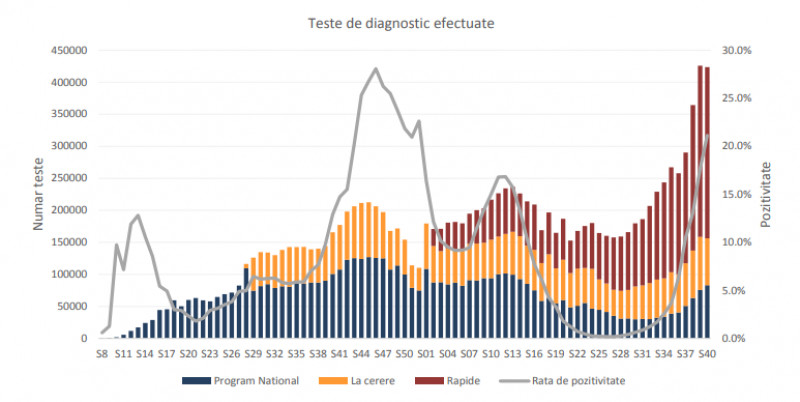 Datele INSP mai arată că în ultima săptămână au fost făcute peste 400.000 de teste, iar rata de pozitivare a trecut de 21%.