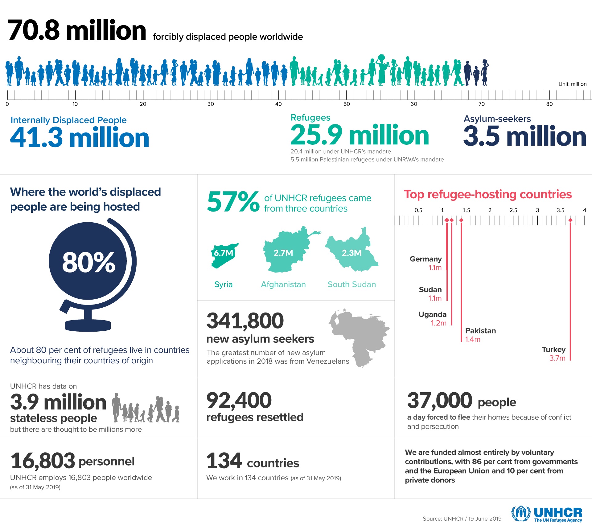 Datele ONU arată că anul trecut, la nivel mondial, erau aproape 26 de milioane de refugiaţi, cei mai mulţi dintre ei fiind din Siria (6,5 milioane), Afganistan (2,7 milioane) şi Sudanul de Sud (2,3 milioane). 80% dintre aceşti refugiaţi îşi caută azil în ţările vecine.