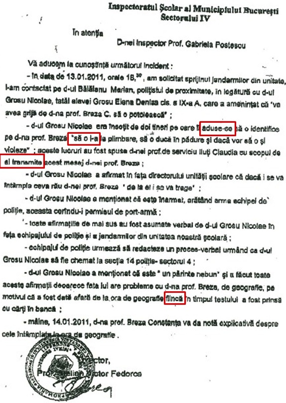 Documentul este trimis de la Colegiu catre Inspectoratul Scolar al Municipiului Bucuresti, in urma unui incident care a avut loc in cursul anului 2011, conform unei proceduri agreate intre unitatile de invatamant si inspectoratele scolare.