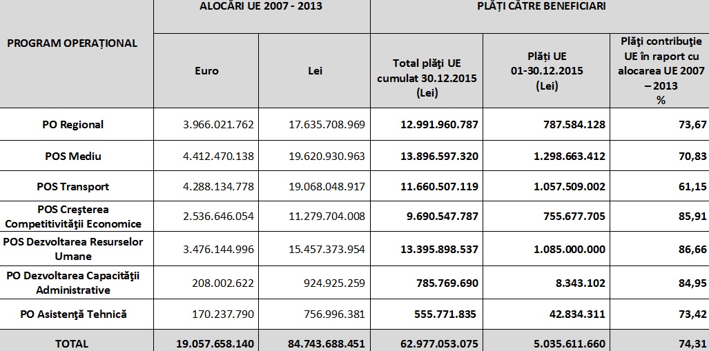 Astfel, procentul sumelor achitate beneficiarilor din 2007 pana la 30 decembrie 2015 se apropie de 75% din alocarea de fonduri structurale si de coeziune a Romaniei, insemnand 62,9 miliarde de lei (circa 13,9 miliarde de euro, la cursul actual).