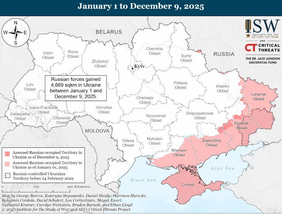 Potrivit datelor analizate de ISW, forțele Moscovei au cucerit aproximativ 4.669 de kilometri pătrați de la 1 ianuarie 2025 și până acum.